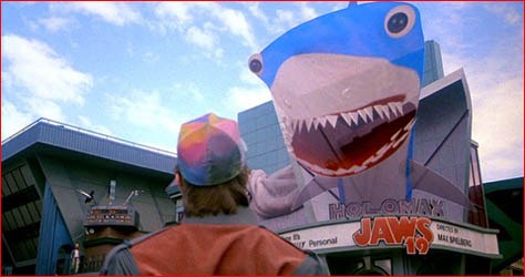 Ahora nos situamos en la 2da entrega de la película. Recordemos que acá había una escena donde Marty McFly veía patinetas voladoras,aerodeslizadores por la calle y cuando lo mordía un tiburón haciendo propaganda a Jaws 19 , todo esto ambientado en el año 2015. El director de esta película, Jaws 19, es Max Spielberg, hijo de uno de los mas influyentes cineastas en la historia del cine, Steven Spielberg. Lástima que a 4 años de la realidad que muestra la película, aun no tengamos aerodeslizadores, patinetas voladoras, el papel repelente al polvo y tan solo tengamos 4 películas de Jaws.