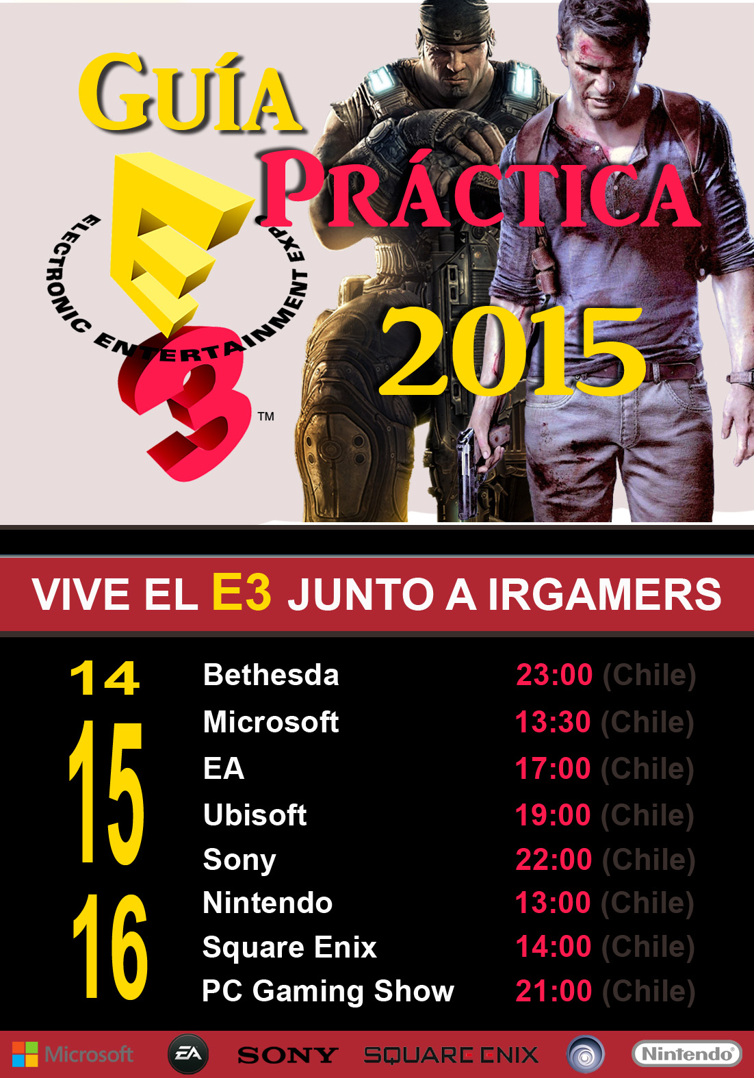 ¿Para qué una guía para este E3? La respuesta es siempre la misma, así que una vez más usaré el tradicional copy/paste de todos los años: «Porque estamos en pleno mes de junio, nadie en este lado del planeta se encuentra de vacaciones. Es más, la mayoría de los que estudian se encuentran en instancias finales de semestres, por lo que realmente nadie tiene el tiempo como para estar pendiente de todo lo que ocurra en el E3 minuto a minuto, noticia a noticia, razón más que suficiente como para que en base a esta guía, puedas organizar bien tu próxima semana. El objetivo entonces es el mismo de años anteriores, el que carece de tiempo podrá organizarse y ver lo que le interese, mientras que el jugador irracional que deja todo botado esta semana tendrá una guía para no perderse detalle.»
